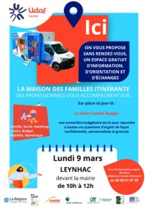 La Maison Des Familles itinérante assurera sa prochaine permanence à Leynhac le lundi 9 mars de 10h à 12h.