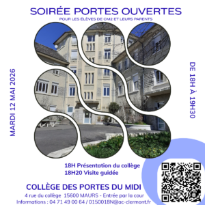 Le mardi 12 mai 2026 de 18h à 19h30 le Collège des Portes du Midi de Maurs organise ses Portes Ouvertes afin d’accueillir les élèves de CM2 et leurs parents.